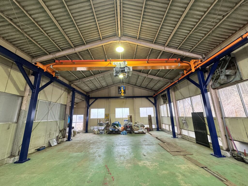 最終日は天井クレーンの取付作業です。クレーンガーダーの取付から始まり、電気工事まで一気に完了させました。試運転では、安定した動きを確認できました。